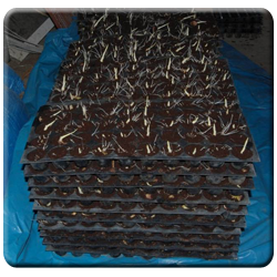 | Fill half of each cone in the tray with coco-pith and place the buds flat or in a slightly slanting position in the cones. Do not press or push it hard and ensure that the bud side faces up. Cover the bud chips in trays completely with coco-pith. |