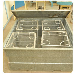 It consists of one rectangular, larger size, solid outer container, made out of 20 g G.I. sheet to hold water and two to three inner containers to hold rhizomes. Washed rhizomes are loaded in the inner cylinder and required quantity of water is added in the outer cylinder. Rhizomes are boiled by the steam liberated from the boiling water. Sodium bicarbonate is added in the boiling water to ad colour. The inside containers which hold turmeric can easily be taken out without wasting boiling water, which can be reused and thereby fuel requirement can be considerably reduced |