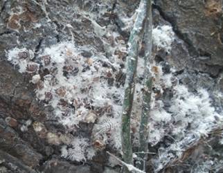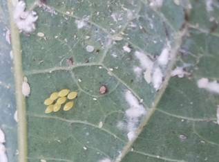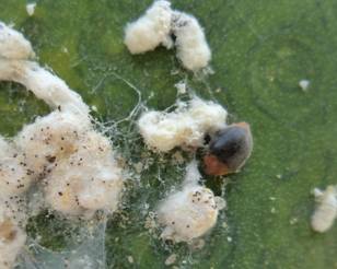 After 15 days of infestation of pumpkins with bugs they are exposed to a set of 100 beetles for 24 hrs. After exposing, the pumpkin is kept back in a cage as described for under production of M. hirsutus. The beetle during the period of exposure feed on mealy bugs as well as deposits their eggs singly or in groups of 4-12. The grubs are visible in such cages within a week of exposure to beetles. The young grubs feed on eggs and small mealy bugs but as they grow they become voracious and feed on all stages of mealy bugs. For facilitating the pupation of grubs dried guava leaves or pieces of papers are kept at the base of each of the cages. The first beetle from the cages starts emerging on 30th day of exposure to C. montrouzieri adults. The beetles are collected daily and kept in separate cages for about 10-15 days to facilitate completion of mating and pre-oviposition. The beetles are also fed on diet containing agar powder (1 g), sugar (20 g), honey (40 cc) and water (100 cc). The adult diet is prepared by boiling sugar in 70 cc of water, adding 1 g agar, diluting 40 cc honey in 30 cc of water and adding to the sugar and agar mixture when it comes to boiling point. The hot liquid diet is kept on small white plastic cards in the form of droplets which get solidified on cooling. Such cards containing adult diet can be fed not only to C. montrouzieri but also to many other species of coccinellids. From each cage about 175 beetles are obtained. The emergence of the beetles is completed within 10 days.