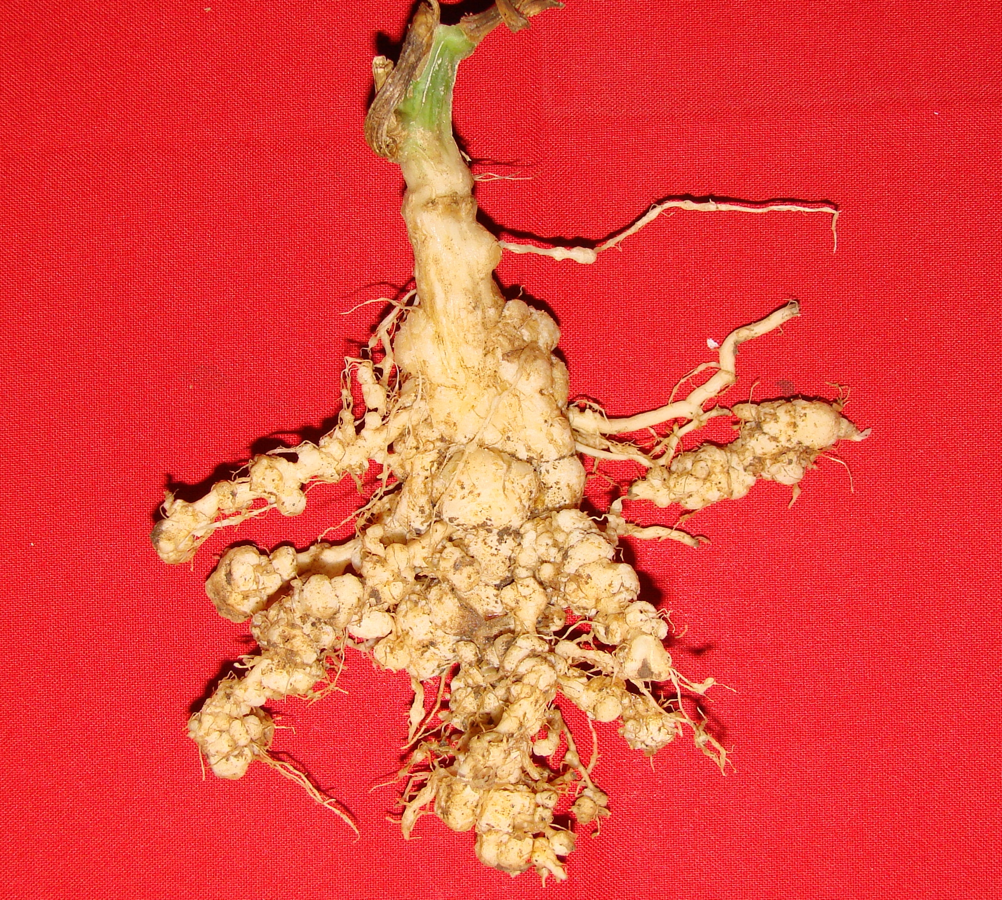 - Presence of galls on the roots (large fleshy galls in Snake gourd, large and firm galls in other vegetable crops, very small galls in chillies).