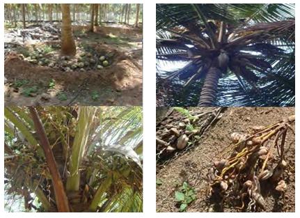 - Thinning of thickly populated gardens: In the farmer’s holdings where thick planting is adopted, many trees give an yield of less than 20 nuts/palm/year. By cutting and removal of these trees, the yield could be increased. Besides, there is saving in the cost of cultivation and increase in net profit. After removal of low yielding trees, the populations should be maintained at 175 palms/ha.