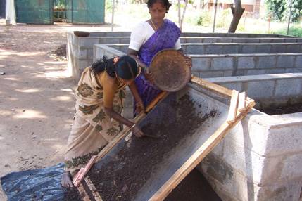 The total decomposition may take about 75 – 100 days depending on various factors. Therefore one tank may be used to 4 to 5 times in a year for vermicompost. A few days before the harvest watering of the tank are discontinued to allow migration of worms towards the bottom of the bed. The compost is then transferred outside without disturbing the bed and heaped on a plain open surface. The compost is sieved through a   3 mm mesh and then packed in gunnies.