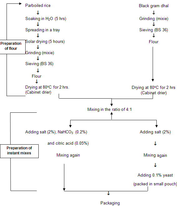 The parboiled rice IR 20 was soaked in water for 5 hours. Then the water was drained completely and dried in solar drier for 5 hrs. The dried rice was ground in a mixie and sieved through BS 36 sieve. Black gram dhal was also ground in a mixie and sieved (BS 36). The rice and black gram flour were dried in a cabinet drier at 80 for 2 hrs, cooled and packed in air tight containers till they were used.