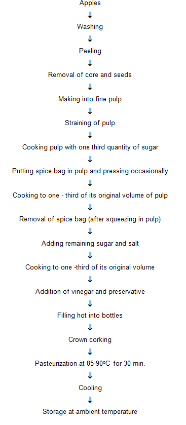 Apple – 1.0 kg, sugar – 250 g, salt – 10 g, onion (chopped) – 200 g, ginger (chopped) – 100 g, garlic (chopped) - 50 g, red chilli powder – 10 g, cloves – 5 Nos. cinnamon, cardamom – 15 g (each), vinegar – 50 ml, sodium benzoate – 0.7 g/kg of finished product.