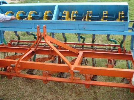 உரமிடும் மற்றும் விதைக்குங்கருவி உரங்கள் பொதுவாக 5 செ.மீ ஆழத்தில் மற்றும் விதைக்கும வரிசையிலிருந்து 5 செ.மீ தொலைவில் இடப்படும். உரமிடுதல் மற்றும் விதை ஊன்றுதல் இரண்டு செயல்களும் ஒரே நேரத்தில் உரமிடும் மற்றும் விதைக்குங்கருவி மூலம் செய்யப்படுகிறது. இக்கருவி அடிப்படையில் விதைக்குங்கருவியை ஒத்தது, இதில் உரத்திற்கு தனியாக கொழுமுனைகள் மற்றும் கலன் அமைந்திருக்கும். எந்திர விதைக்குங்கருவி இவ்வகை எந்திர விதைக்குங்கருவியில் ஒரு விதைக்கலன் அடிப்பகுதியில் சிறு துளைகளுடன் காணப்படும். அத்துளைகளில் விதைக்குழாய்கள் விதைகள் செல்வதற்காக இணைக்கப்பட்டிருக்கும். ஒரு சுழலும் தன்மைக் கொண்ட, களைகளை உடைய தட்டு அடிப்பகுதியில் இணைக்கப்பட்டிருக்கும். சுழலும் தட்டின் துளையும், கலனின் அடிப்பகுதியில் உள்ள துளையும இணையும் போது, விதை, விதைக்குழாயின் வழியாக மண்ணை அடைகிறது. இரண்டு துளைகளுக்கு இடையேயுள்ள இடைவெளி தூரம், இரண்டு பயிர் வரிசைகளுக்கு இடையேயுள்ள இடைவெளியை மாற்றலாம். பயிர்களுக்கு இடையேயுள்ள இடைவெளியை சுழலும் தட்டுத் துளைகளை மாற்றுவதன் மூலம் மாற்றி அமைக்கலாம். பல்வேறு மேம்பாடுகளைக் கொண்டு தானியங்கி விதைக்குங்கருவிகளும் உள்ளன. இடை உழவுற்க்கான கருவிகள்