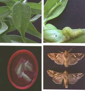 - புழு – பச்சை நிறத்தில், உடல் முழுவதும் பழுப்பு நிறப் புள்ளிகளுடன் காணப்படும்