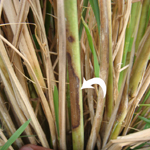 - பயிரின் அடிப்பாகத்தில் இடைக்கணுத் தாக்குதலும் ஏற்படுவதால், வெண் கதிர் அறிகுறி தோன்றும்.
