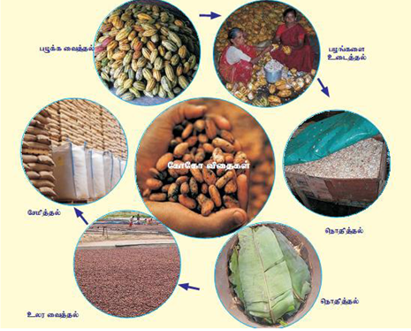 அறுவடை செய்த காய்களை நிழல் உள்ள இடங்களில் 5.6 நாட்கள் குவியலாக குவித்து சீராக பழுக்க வைக்க வேண்டும். இந்த பழங்களின் விதைகளில் உள்ள அமிலத்தன்மை குறைந்து வாசனைத் தன்மை ஏற்படுவதற்கு வழி வகுக்கும். மேலும் உலர் விதையினர் எடையையும் அதிகரிக்கும்.