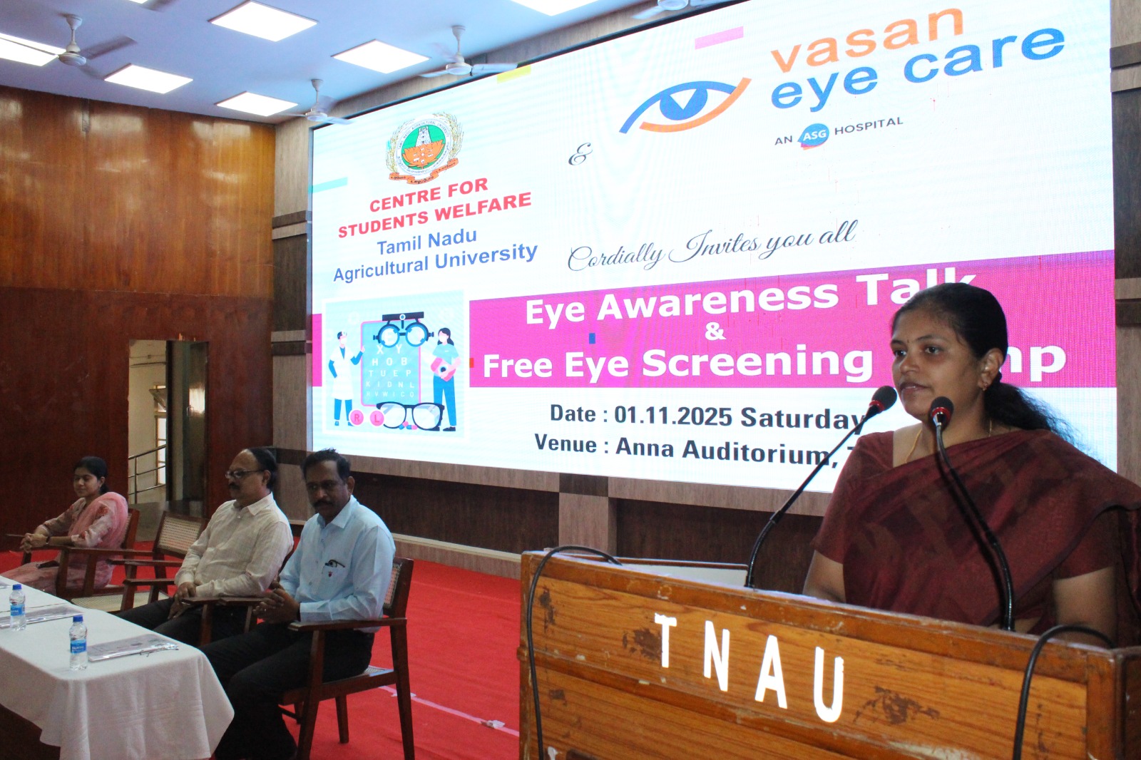 Dt 03.11.2025 தமிழ்நாடு வேளாண்மைப் பல்கலைக்கழக கண் பராமரிப்பு விழிப்புணர்வு நிகழ்ச்சி மற்றும் இலவச கண் முகாம். / image 1 / image 2 / image 3 / image 4